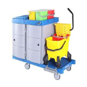 - Storage room or Cupboard has 2 doors that helps the operator loading and unloading cleaning items from left and right sides. Two strong plastic trays for supporting and carrying different tools on it and avoiding unpleasant dripping on the floor while cleaning it. Locker with key is optional.