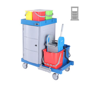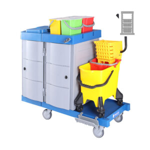- Storage room or Cupboard has 2 doors that helps the operator loading and unloading cleaning items from left and right sides. Two strong plastic trays for supporting and carrying different tools on it and avoiding unpleasant dripping on the floor while cleaning it. Locker with key is optional.