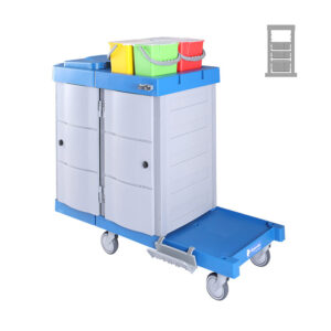 • Storage has doors with locker that helps the operator loading and unloading cleaning items from left and right sides. Two strong plastic trays for supporting and carrying different tools on it and avoiding unpleasant dripping on the floor while cleaning
