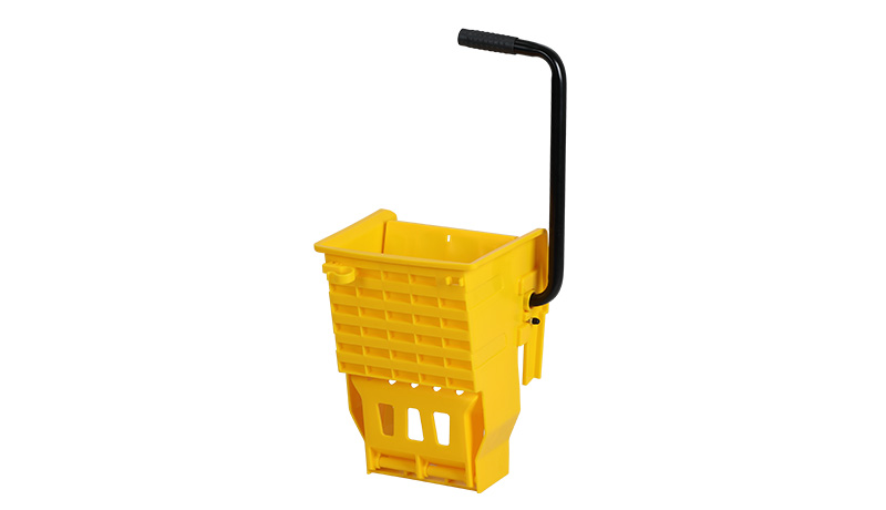 Wringer base is designed to stand upright when removed, to minimize bending while emptying the bucket. Integrated wringer-guides ensure a secure connection to mop bucket, providing stability while wringing and maneuvering.