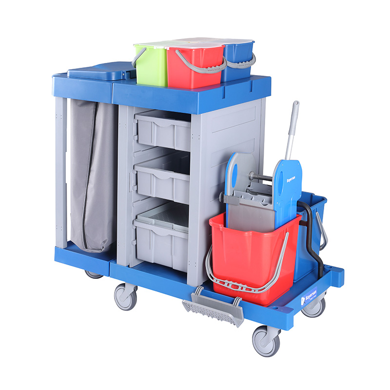 It is a multipurpose trolley which is used at disinfection in hospital elderly care homes, clinics, dusting, waste collection, floor mopping and cleaning of surfaces areas